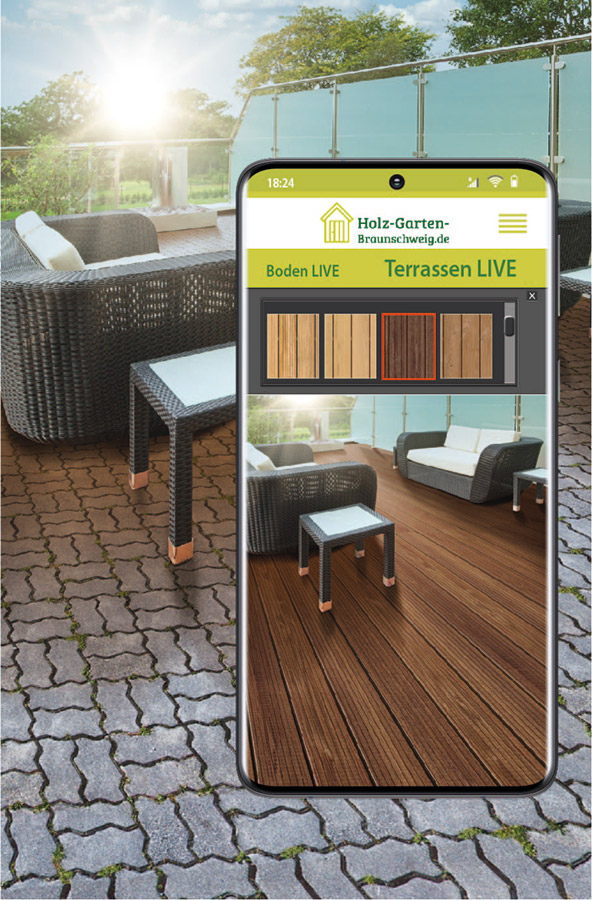 Terrasse Live ist ein Service von Holz Garten Braunschweig um Ihre Holzterrasse oder WPC-Terrasse direkt und sofort digital in Ihrem Garten bzw. Grundstück zu verlegen und das in der Region rund um Braunschweig, Wolfenbüttel, Wolfsburg, Salzgitter und Peine.
